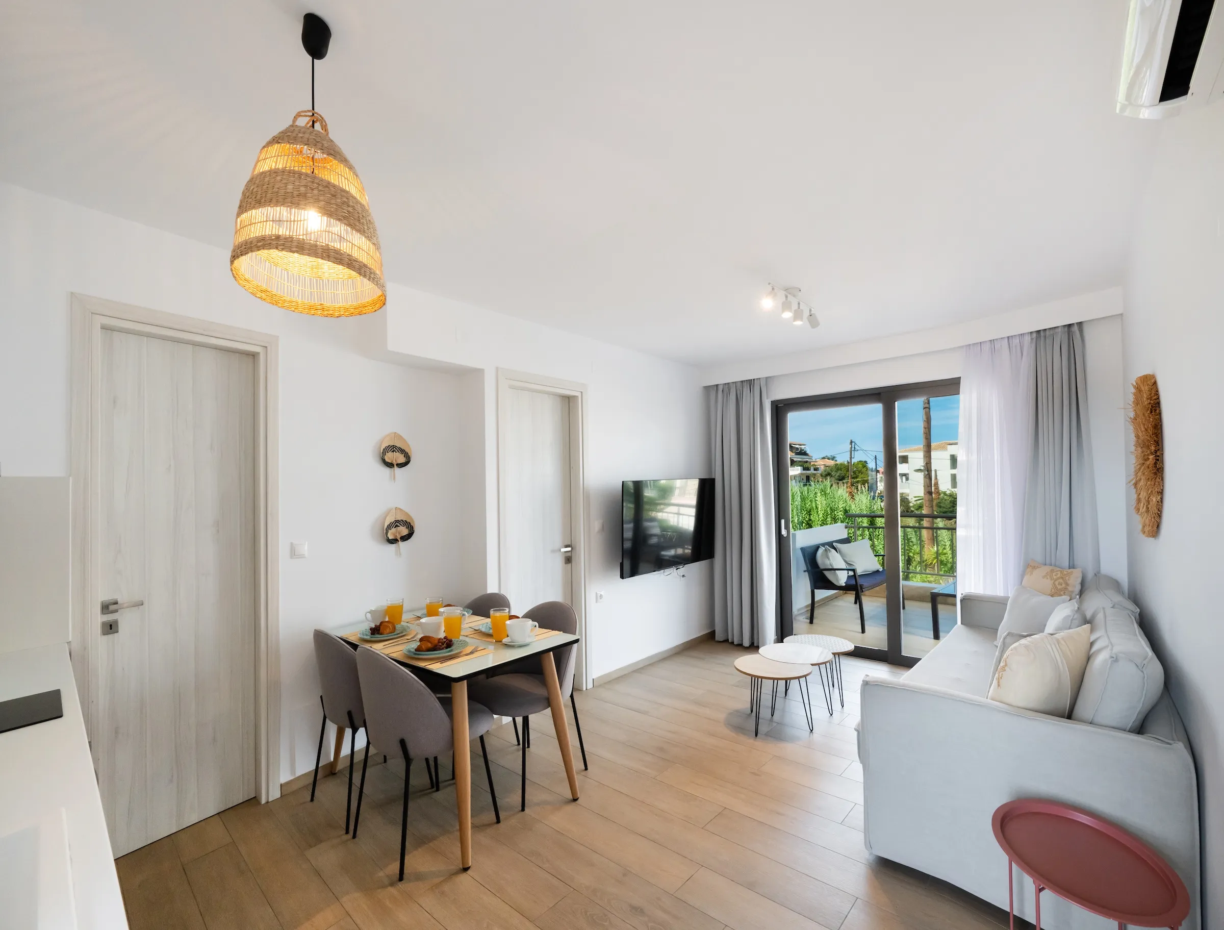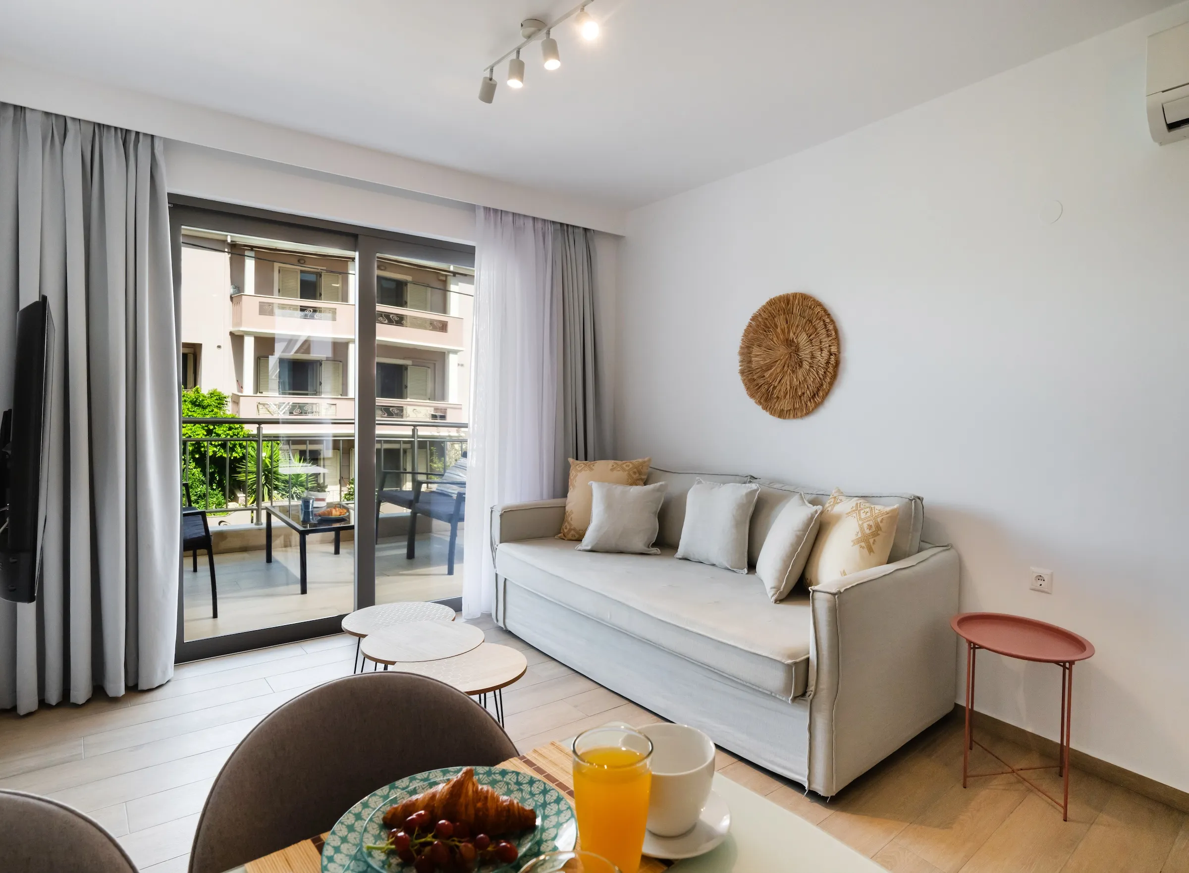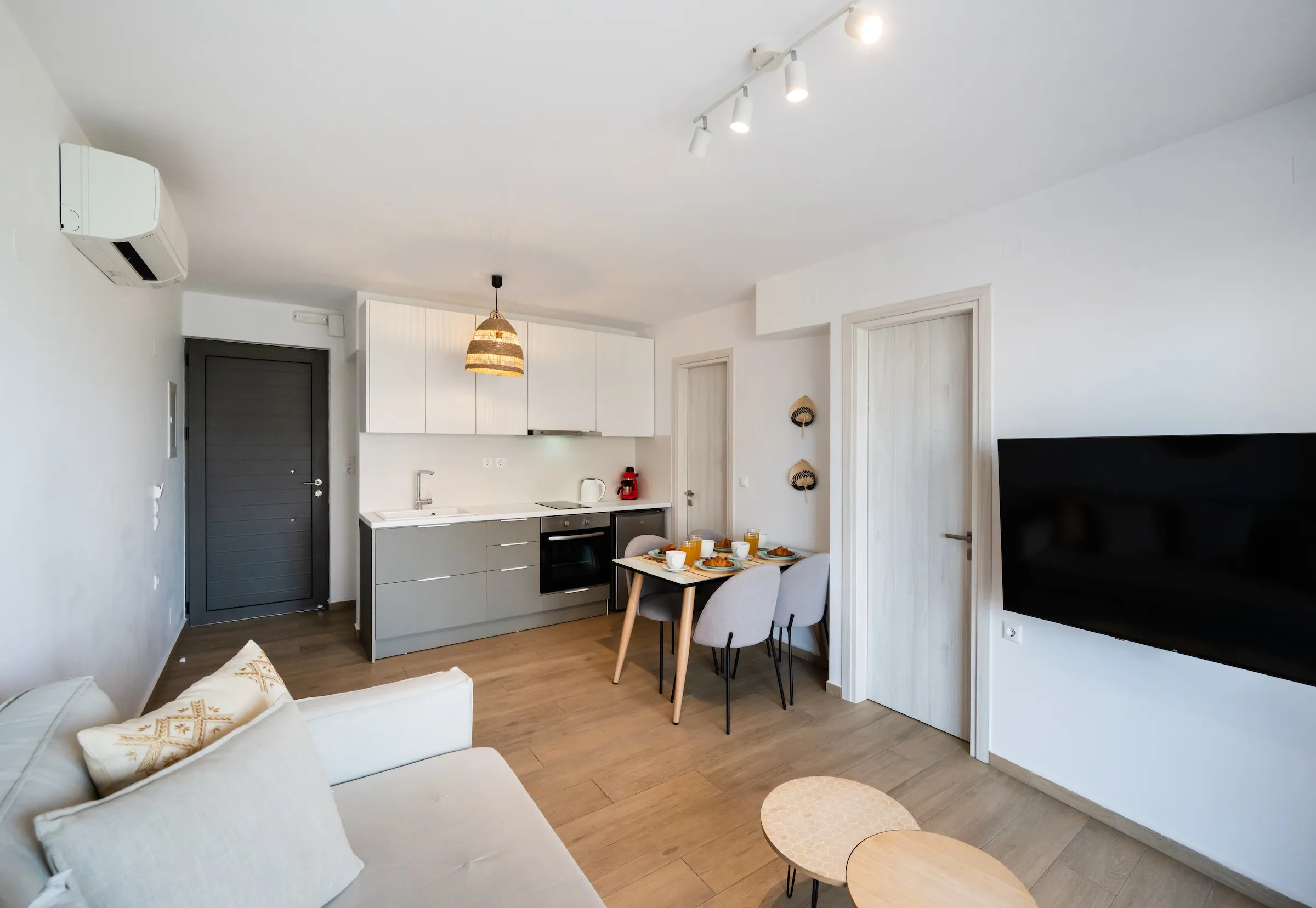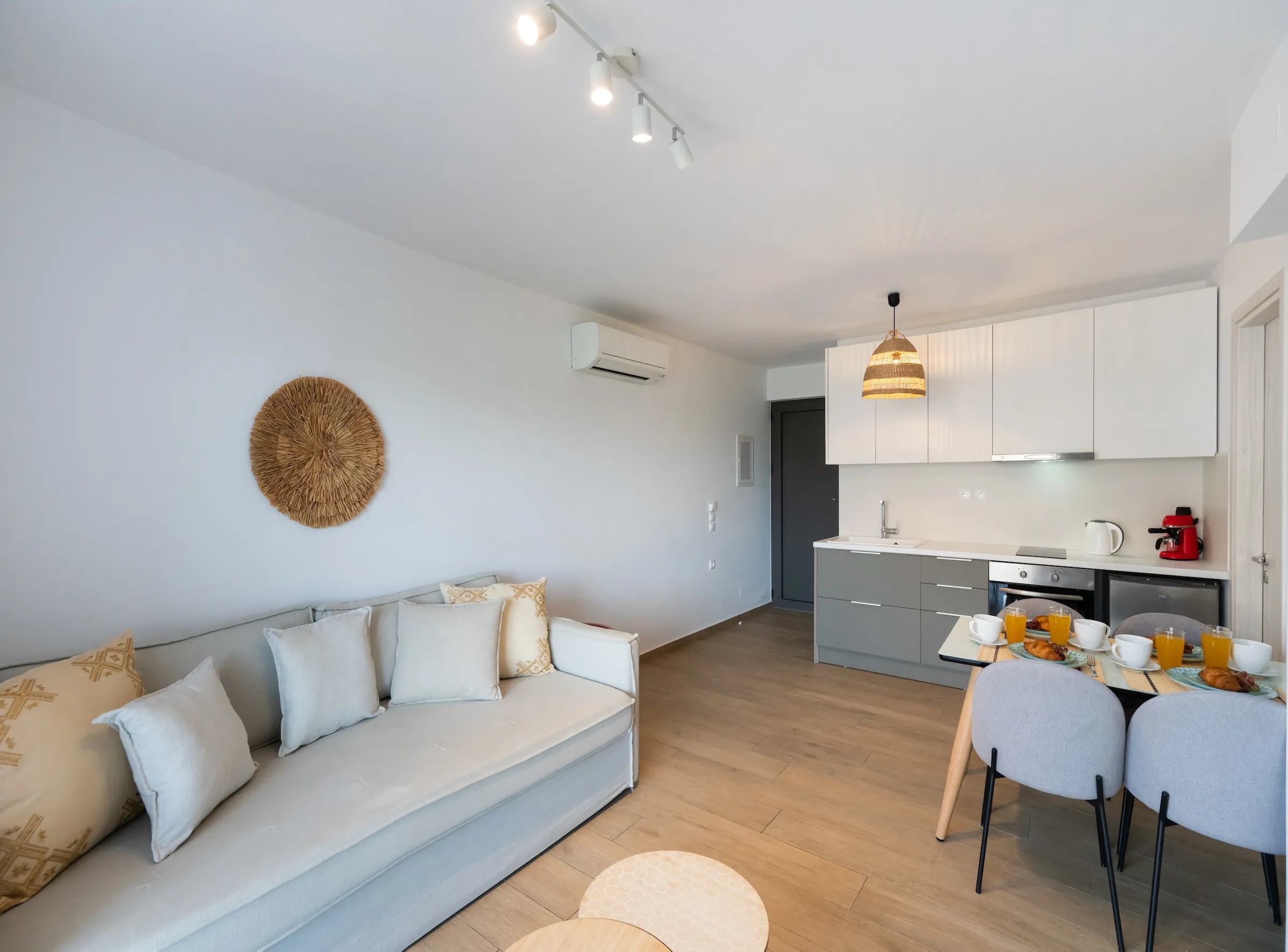 Το καθιστικό είναι φωτεινό και λειτουργικό, ιδανικό για χαλάρωση ή κοινό χρόνο, ενώ η πλήρως εξοπλισμένη κουζίνα καλύπτει όλες τις ανάγκες μιας αυτόνομης διαμονής. Το ιδιωτικό μπαλκόνι με θέα στην πόλη προσφέρει έναν επιπλέον χώρο χαλάρωσης κατά τη διάρκεια της ημέρας.