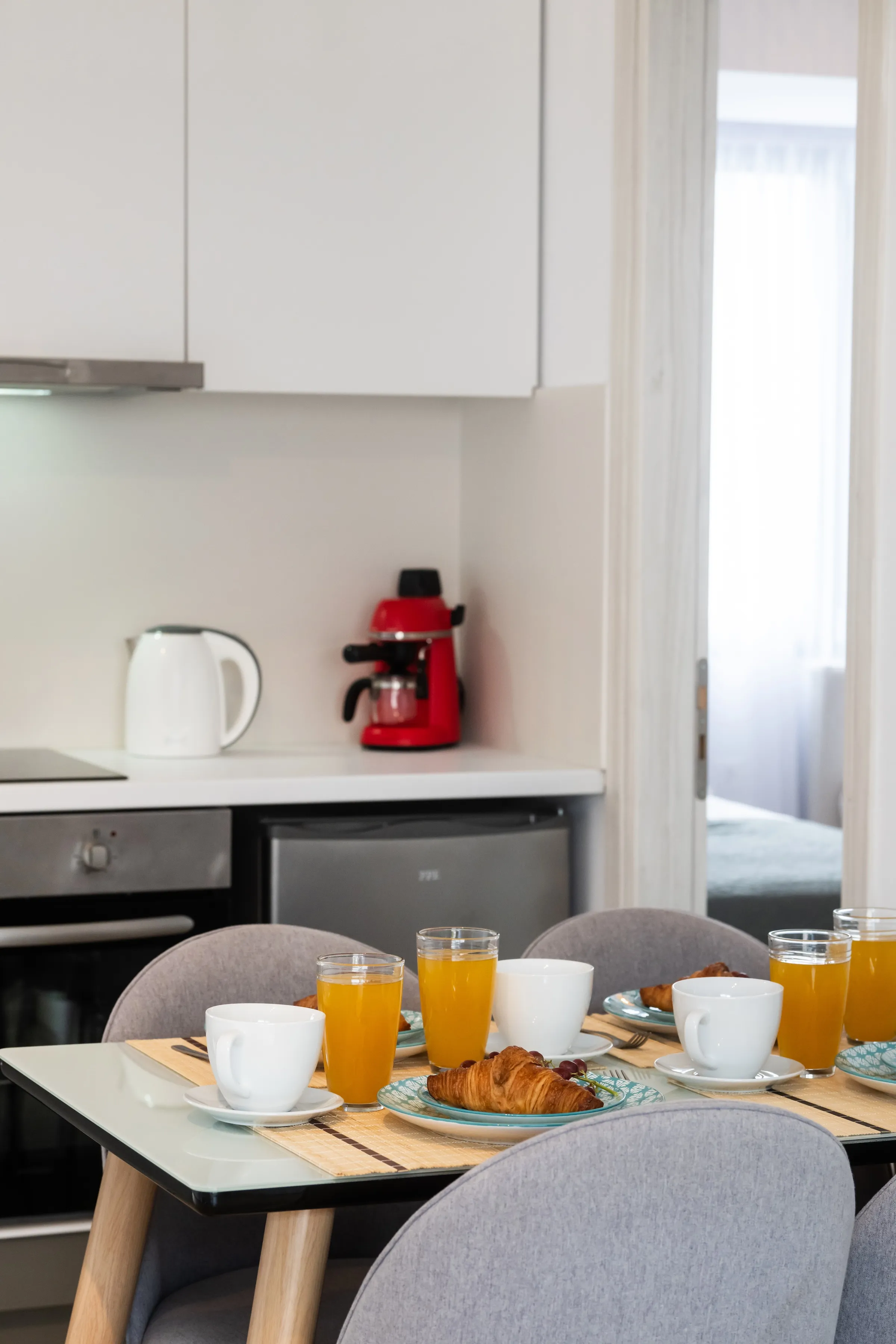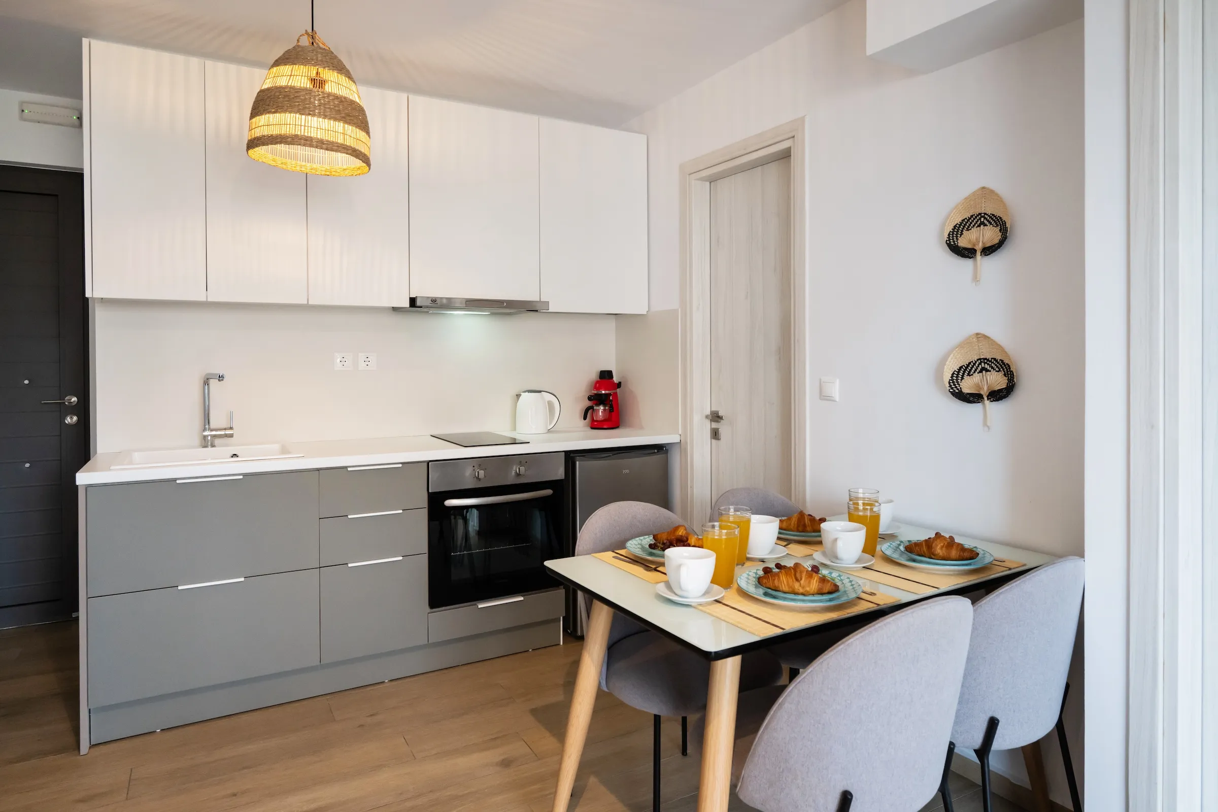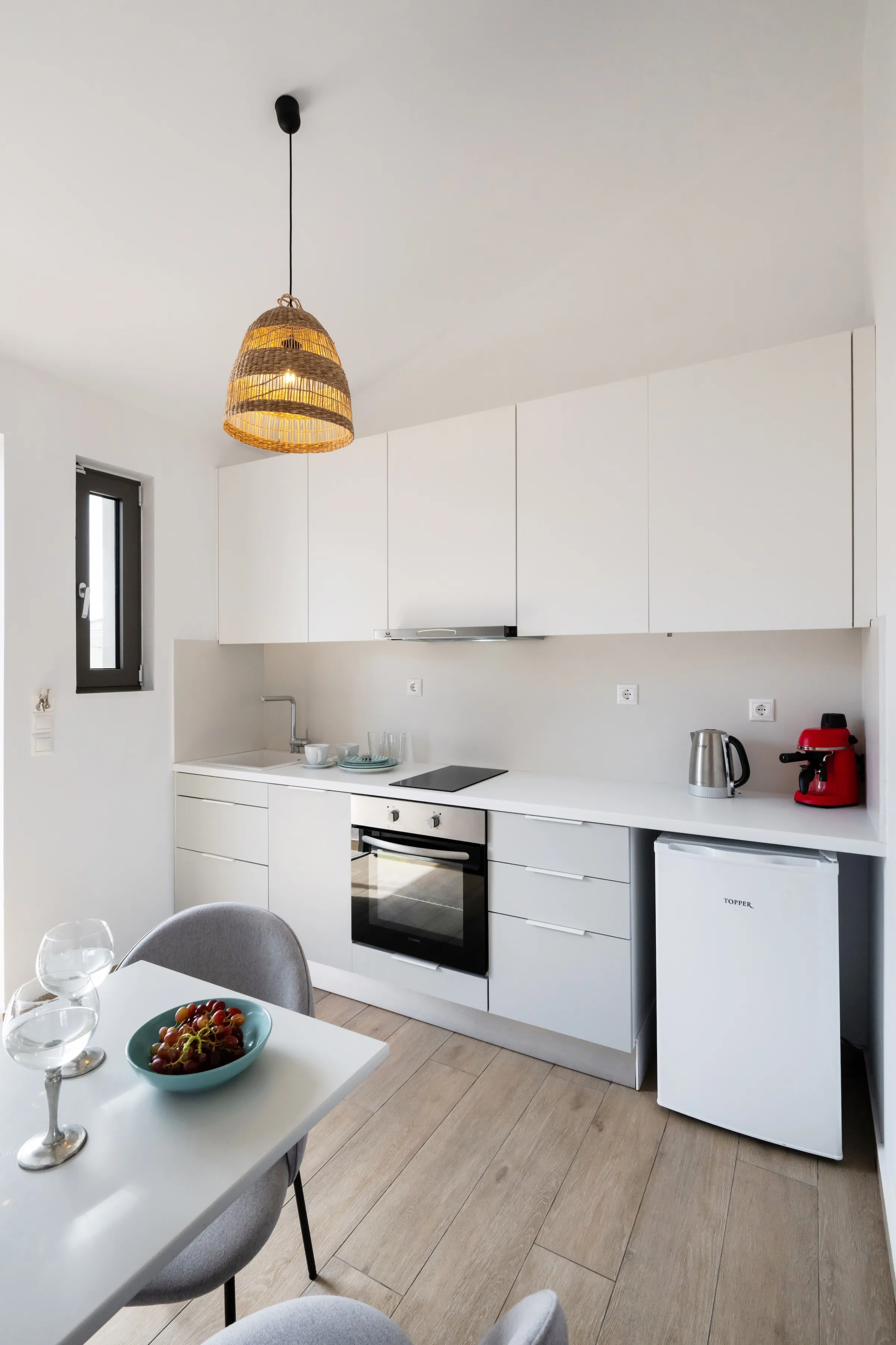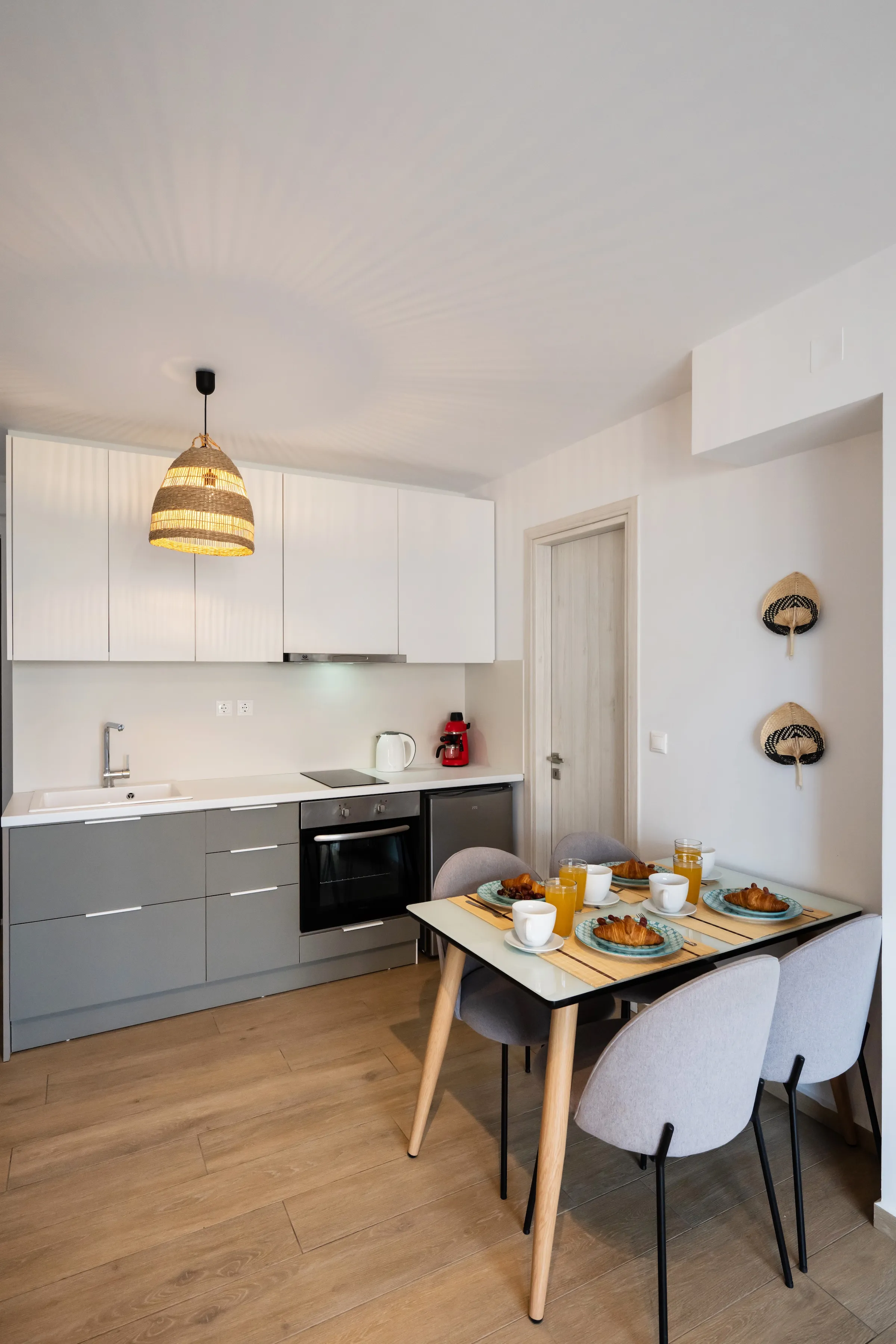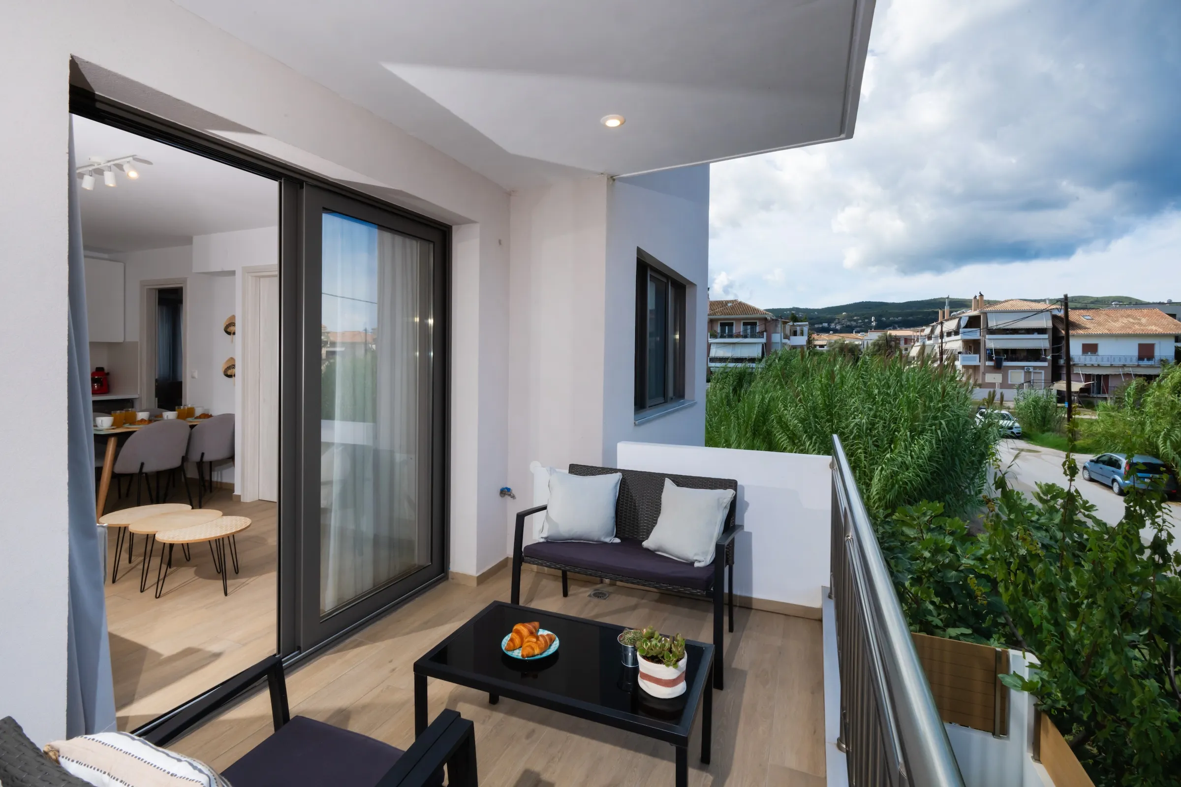 Το καθιστικό είναι φωτεινό και λειτουργικό, ιδανικό για χαλάρωση ή κοινό χρόνο, ενώ η πλήρως εξοπλισμένη κουζίνα καλύπτει όλες τις ανάγκες μιας αυτόνομης διαμονής. Το ιδιωτικό μπαλκόνι με θέα στην πόλη προσφέρει έναν επιπλέον χώρο χαλάρωσης κατά τη διάρκεια της ημέρας.