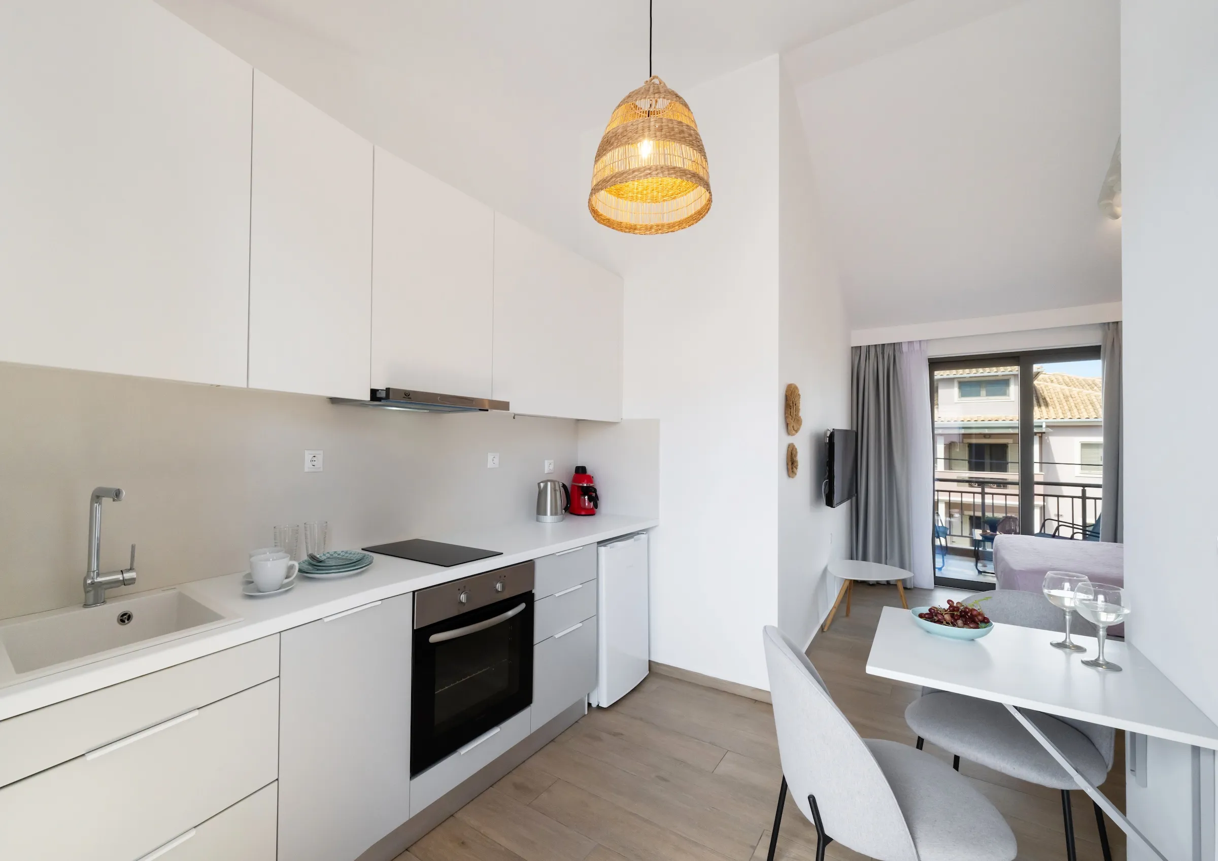 Η πλήρως εξοπλισμένη κουζίνα καλύπτει τις ανάγκες καθημερινής χρήσης, επιτρέποντας την εύκολη προετοιμασία γευμάτων, ενώ το ιδιωτικό μπαλκόνι με θέα στην πόλη αποτελεί έναν ευχάριστο χώρο για χαλάρωση. Το μπάνιο είναι σύγχρονο και λειτουργικό, με ντους, προϊόντα περιποίησης και στεγνωτήρα μαλλιών, εξασφαλίζοντας άνεση καθ’ όλη τη διάρκεια της διαμονής.